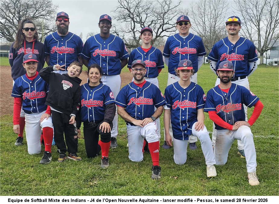 - 33ème saison sportive du club des Indians - C'était le samedi 28 février J4 - suite IIème OPEN de Softball Mixte - Lancer modifié - L'équipe de Softball Mixte se déplaçait chez les Panthères de Pessac Pessac vs INDIANS: 13 - 8 et 11 - 21 Photo Plateau 1 du Championnat de Nouvelle Aquitaine Beeball 9U à Bon-Encontre - L'entente INDIANS/Bca recevait les ententes La Force/Pineuilh et Le Porge/Pessac L'entente INDIANS/Bca termine 2ème du plateau avec 2 victoires et 2 défaites. Merci au coach Nicolas et aux arbitres Romain et Laurent. Photo C'était le dimanche 1° mars J1 - Championnat de Nouvelle Aquitaine R1 - L'équipe sénior, Championne en titre 2025, se déplaçaient chez les Pumas de Pau Pessac vs INDIANS: 9 - 6 et 10 - 4 Photo (Bca vs St Aubin de M: 12 - 6 et 11 - 14) (Angoulême vs Pessac: 9 - 6 et 4 - 7) |