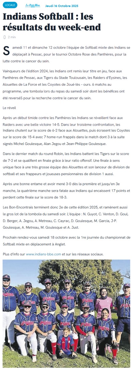 OPEN DE SOFTBALL MIXTE NOUVELLE AQUITAINE 2025 - C'est Parti ! Absents depuis 6 ans, les Indians renouent avec la compétition dans cette catégorie. Les Indians se déplacent chez les Gambas d'Anglet VS