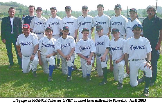 15 ans. • L'effectif Cadet de notre club était plutôt conséquent et nos jeunes sont resté motivés et concentrés pour se qualifier pour la phase 2 et pour arriver jusqu'à la Finale du 21 juin. • Mathieu Fréaud et Christian Cayrac n'ont pas réussi l'exploit de faire remporter la finale 2003 aux Cadets Indians face à une équipe de Pineuilh plus mature et peut être un peu plus expérimentée. Score de la Finale: 6 - 5 pour Pineuilh. |