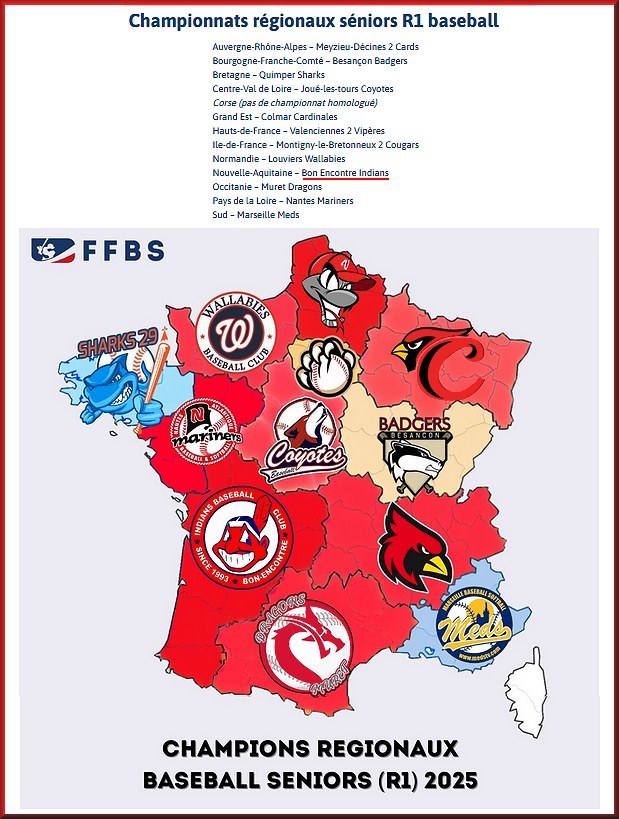 du club et du rangement matériel et boutique. - Vendredi 10 février: Voeux de Madame le Maire de Bon-Encontre. Les Indians sont récompensés pour le titre de Champion de Nouvelle Aquitaine R2. Nicolas GUYOT , le manager reçoit la récompense et Luis ROJAS CUICAS reçoit un trophée pour son titre de MVP des phases finales du Championnat. Photo - Samedi 11 janvier, quelques membres du club font du rangement et des aménagements dans le clubhouse des Indians. - Dimanche 19 janvier, Les Indians organisent un tournoi Indoor de Softball Fastpitch à 4 équipes dans la salle de l'espace Lomet à Agen. C'est la Bambino Team qui remporte le tournoi devant les Indians (4 matchs - 2 victoires - 2 défaites). Les Tigers du Stade Toulousain finissent 3ème et les Panthères de Pessac 4ème. Photo des Indians L'affiche Tous les résultats - Dimanche 26 janvier, Les Indians remportent le Tournoi de Softball Mixte Fastpitch des Panthères de Pessac face aux Lynx d'Angoulême, les Panthères de Pessac et les Raiders d'Eysines avec une fiche de 4 matchs et 4 victoires. Photo de l'équipe Article - Vendredi 31 janvier, deux nouveaux candidats rejoignent le Comité Directeur suite à l'Assemblée Générale du club: Amandine METREAU et Luis Alejandro ROJAS CUICAS. Le Comité regroupe désormais 14 membres (6 filles et 8 garçons). Comité Directeur - Dimanche 23 février, Les Indians remportent le tournoi Indoor de Softball Mixte Fastpitch des Alouettes de La Force avec une fiche de 3 matchs et 3 victoires. Photo - Samedi 1 et dimanche 2 mars, Les Indians remportent le XIIème Tournoi Indoor de Softball Mixte Fastpitch des Raiders d'Eysines avec une fiche de 6 matchs et 6 victoires. Photo Photo - Samedi 15 Mars: Premères rencontres du Championnat de Nouvelle Aquitaine pour l'entente Pumas de Pau/Indians en Baseball 15U à Anglet au Pays Basque avec deux défaites prometeuses . Photo - Dimanche 16 mars: Opening Day du Championnat de Nouvelle Aquitaine R1. Les Indians reçoivent les Raiders d'Eysines et remportent leurs deux premières rencontres de la saison. Affiche Photo - 15 avril: Nicolas GUYOT, Manager des Indians, s'envole pour les USA pour une tournée des stades de Baseball. Au programme 17 stades pour 25 matchs de MLB sur une durée de 45 jours. Les réseaux sociaux suivent Nicolas. BaseballTV parle de lui et, durant 1 mois et demi, il est possible de suivre Nicolas ici: Around the USA. Un lien Instagram ici pour suivre notre vedette. nicoaroundtheusa. On parle de lui aussi sur le site des Indians et sur la page facebook du club. Indians - Dimanche 27 avril: A mi-parcours du championnat de Nouvelle Aquitaine R1, Les Séniors Indians sont leaders avec une fiche de 8 victoires et 2 défaites. C'est déjà une excellente nouvelle quand on sait que l'équipe est montée en R1 au mois de mars. - du 1er au 4 mai: Les Indians sont sollicités par la Mairie pour tenir la buvette des fêtes de Bon-Encontre. C'est une première pour le club des Indians qui assurera le challenge jusqu'au dimanche soir 19h. - Samedi 31 mai: Les Indians participent à la journée Alliance Japon à 'espace Culturel Miterrand de Boé et propose une initiation au Baseball avec tunnel de frappe. - Dimanche 15 juin: Les Indians terminent leur saison régulière avec une fiche de 20 matchs, 11 victoires pour 9 défaites. (3ème place en nombre de victoires-défaites derrière Angoulême et Pau). Pour la Ligue de Nouvelle -Aquitaine (la seule à établir un classement par points), les Indians sont classés premiers au nombre de points accordés par le système du CMD. - Samedi 28 et dimanche 29 juin sur l'Indians Ballpark de Bon-Encontre: Phases Finales du Championnat de Nouvelle Aquitaine R1 organisées par le club des Indians. The FINAL FOUR. Les Indians battent les Pumas de Pau en demi-finale sur le score de 16 à 4 pendant que Pessac bat Angoulême 11 à 8. Le lendemain, les Indians remportent la FINALE du Championnat 2025 sur le score de 18 à 17 et deviennent CHAMPIONS DE NOUVELLE AQUITAINE R1. Steven Vesque est élu MVP de la Finale. Pour le 3ème année consécutive et dans 3 différentes divisions, les Indians remportent le titre régioanl. Du jamais vu depuis l'existence de la Ligue ! Photo Affiche du Final Four Photo des champions Avec ce titre de Champion 2025, c'est le 33ème titre régional que remporte les Indians, toutes catégories confondues depuis 1994, date de la toute première rencontre officielle pour le club. - du 18 au 20 juillet: Luis ROJAS CUICAS et Michel GOULESQUE se rendent en Italie avec des élus de Bon-Encontre et Mme DUMAS, Présidente du Comité de Jumelage, pour participer aux 'Ier Games Without Borders' de Reggiolo (Italie) avec d'autres jeunes de Bon-Encontre. 6 nations étaient représentées (Italie, Pologne, Portugal, Belgique, Espagne et France) et les Bon-Encontrais terminent 2ème de la compétition. Photo Photo Photo - Dimanche 31 août: Les Indians rencontres les Dragons de Muret en pleine préparation de Play-Off de D3, pour deux rencontres amicales à Bon-Encontre. Photo - Mercredi 3 septembre: C'est la rentrée pour les jeunes du club et pour le recrutement. - Samedi 6 septembre: Les Indians sont présents à la fête des associations de la ville de Boé. - Mardi 9 septembre: Les Indians apprennent qu'ils ont été retenu par la Fédaration pour organiser en collaboration avec le Stade Toulousain Baseball, le CHALLENGE DE FRANCE des clubs de première division 2026. Cette manifestation aura lieu en mai et les Indians, qui ont déjà reçu le Challenge en 2004 et 2015, recevrons des matchs sur les 3 premiers jours de la compétition. - Samedi 13septembre: Les Indians sont présents au forum des associations de la ville de Bon-Encontre. - Samedi 20 et dimanche 21 septembre: Les Indians organisent la XVIème édition du Tournoi Baseball 'Arnaud Varnat' avec les clubs de Pineuilh, Le Porge, Sarliac, le Stade Toulousain et les Indians, tenants du titre 2024. 20 ans après la toute premi